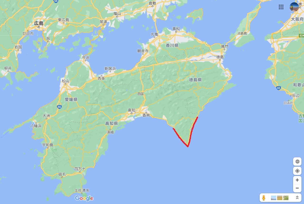 岡山を出発して高知までのルートを足すとこんな感じ。